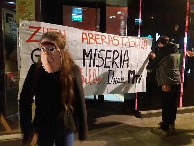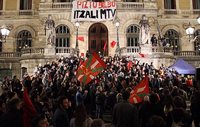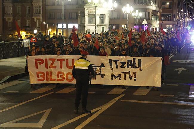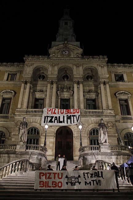 Por todo ello el pasado 29 de octubre, desde PiztuBilbo, Itzali MTV, presentamos en rueda de prensa un calendario de movilizaciones con el objetivo de hacer una llamada a la participación de todos aquellos que sienten como algo imprescindible para construir otro Bilbo, el plantar cara a este modelo de ciudad hegemónico. El primero de los actos tuvo lugar el 1 de noviembre y consistió en una kalejira por las calles del Casco Viejo. La intención de ésta, era finalizar en la plaza del Teatro Arriaga, sin embargo nos encontramos con una plaza totalmente tomada por las fuerzas de la Ertzaintza. Los agentes, visiblemente irritados con nuestra presencia, nos obligaron a apagar la música que ambientaba la kalejira. Al parecer, en la MTV MusicWeek sólo se puede cantar y bailar en los espacios privatizados por la organización del evento y a los ritmos que marca la todopoderosa MTV. Nosotros lo dejamos claro, no permitiremos que ninguna gran empresa ni ningún poderoso oligarca de txapela y corbata, nos diga qué cantar o dónde bailar, pues creemos que el espacio en la ciudad debe ser un bien común, un punto de encuentro para todos, por ello, aquellos que tienen como objetivo la privatización del uso del espacio público y su comercialización, aquellos que quieren convertir la ciudad en un mero escaparate donde los turistas puedan sacarse fotos, nos tendrán enfrente.