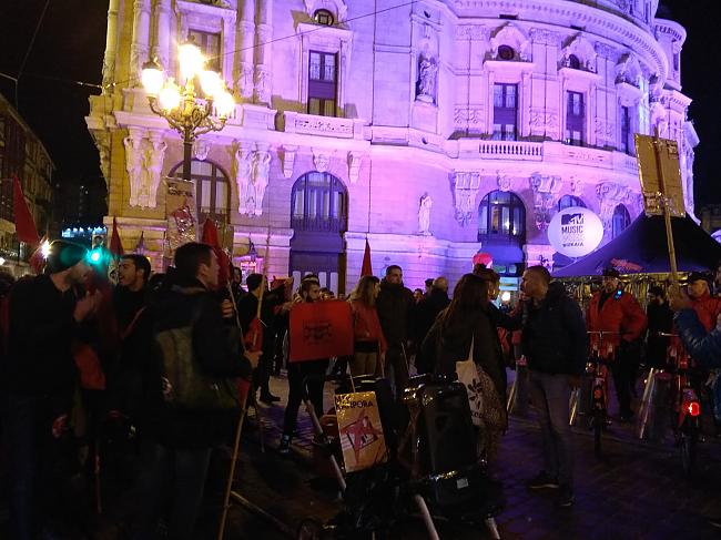 Barrikada batean bizi gara eta hau nahiko argi geratu zen kalejira Arriaga Antzokira iritsi eta polizia eta segurtasun pribatuak porrazoka eta bultzaka bertatik urrunduarazi gintuztenean. Gainera, salatu nahi dugu arratsalde hartako poliziaren jokaera onartezina gutxi ez balitz, mobiliazioetan parte hartzen ari zen emakume bat atxilotua eta Ertzaintzaren komisaldegira trasladatua izan zela “autoritateari atentatu” egitea egotzita. Beste kide ugari identifikatuak eta isun ekonomikoekin mehatxatuak izan ziren. Piztu Bilbo Itzali MTVtik gure elkartasun guztia adierazi nahi diogu mobilizazioetan zehar errepresio polizialarengatik kaltetua izan zen edozeini. Eguna bukatzeko, beti ere “beltzen” zenbait furgonaren begiradapean, antolatuta geneukan performance-az disfrutatu ahal izan genuen, zirko eta antzerki talde batek MTVak humoretik salatu zituelarik.