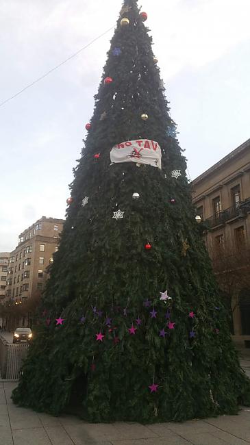 Hoy al mediodía, Mugitu! Mugimendua ha subido a uno de los mayores símbolos del consumismo navideño- el pino de Navidad situado delante de la diputación de Navarra-y ha colocado una bandera anti TAV en el mismo. Este es el comunicado explicativo de la acción:
