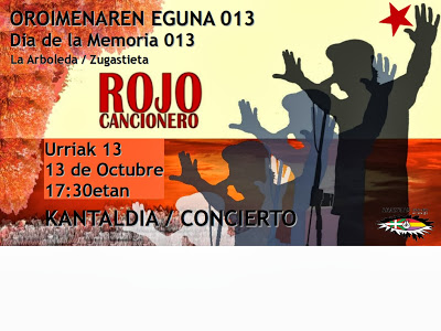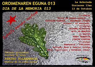 El próximo día 13 de Octubre, domingo, y en el pueblo de La Arboleda / Zugastieta, en Bizkaia, la asociación de victimas del golpe de estado, de la represión y del régimen franquista Ahaztuak 1936-1977 celebraremos el "Oroimenaren Eguna 013 / Dia de la Memoria 013". Será el quinto año consecutivo celebrando este dia que pretende ser una jornada de memoria y reivindicación de la memoria histórica democrática y antifascista de Euskal Herria y de todas las victimas del franquismo, asi como de exigencia del fin de la impunidad para todos los crimenes cometidos por el régimen franquista y de la impunidad tambien para las personas que los cometieron. Junto con ello tambien honraremos y reivindicaremos el carácter de luchadores antifascistas de muchas de dicvhas víctimas, independientemente de la organización en que militasen o de la forma de lucha empleada para enfrentar al régimen fascista surgido del golpe de estado del 18 de Julio de 1936 en todo el periodo de tiempo que este duró.