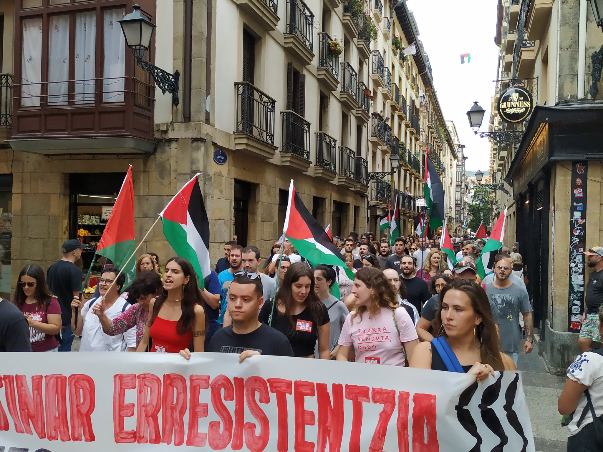 Palestinarekin Elkartasuna plataformaren deialdiari jarraituz, asteburu honetan milaka pertsona mobilizatu dira Palestinar herriari elkartasuna adierazteko eta Israelen eta Mendebaldeko konplizeen jokabidea salatzeko. Ostiralean, Aste Nagusian ere, Israel borrokatu lelopean, Bilboko Plaza Eliptikotik abiatu zen manifestazioa, eta Arriaga plazan amaitu zuten protesta. Han irakurritako agirian, Aste Nagusian Palestina presente egotea exijitu zuten: “Une guztiak dira onak genozidioari aurre egiten jarraitzen duen herri duin eta ausarta ikusarazteko”. Plataformaren ustez, jaiak “aldarrikapen diferenteak sozializatzeko beste gune bat” dira, eta horregatik egin dute lan hainbat jai batzorderekin, aldarrikapen batzuk azaleratzeko asmoz. “Palestinako herriari eta bere erresistentziarako eskubideari babes osoa adierazi behar diogu” adierazi zuten. Eta gehitu zuten ezin dela ekidistantziarik egon, Palestinan gertatzen ari dena ez baita berdinen arteko gatazka bat: “Hemen, entitate genozida bat eta bere askatasunarengatik borrokatzen ari den herri bat daude; beraz, ezin dira inolaz ere zapaltzailea eta zapaldua berdindu”. Era berean, azpimarratu zuten “basakeria koloniala” ezin dela berdindu “jatorrizko herri baten autodefentsa zilegiarekin”.