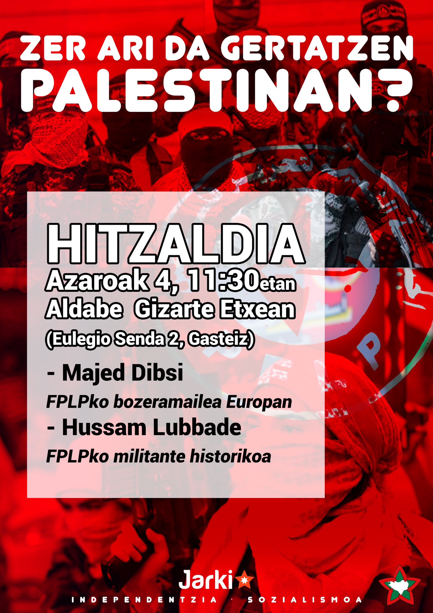Aste honetako ostegun, ostiral eta larunbatean JARKI antonlakunde iraultzaileak hainbat hitzaldi antolatu ditu Hego Euskal Herriko hiriburuetan non FPLP-aren delegazio bat Gazan gertatzen ari den genozidioari egun Erresistentzia Palestinarrak nola aurre egiten dion eta borroka molde ezberdinez arituko dira.