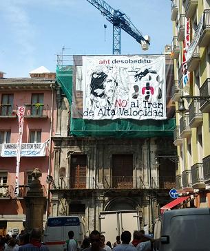 Esta mañana en la Plaza Navarrería de Iruñea, en plenos Sanfermines, se ha descolgado una gran pancarta en solidaridad con los imputados por los tartazos contra el TAV a Yolanda Barcina, acción desobediente ocurrida en Tolouse en 2011.