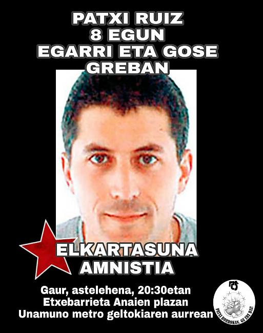 Patxi Ruizek gose eta egarri grebako zazpigarren eguna betetzen du gaur. Hurkoei egindako deian bere borroka berretsi du eta bukaerara arte joateko prest dagoela esan du. Egunak pasatu arren, konbikzio eta koherentzia osoz hitz egiteko gai izan da.