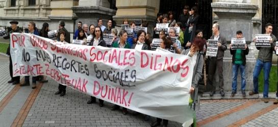 Unas 50 personas protestaron ayer en Bilbao por los recortes y la falta de un presupuesto suficiente para atender las necesidades de las personas y familias afectadas por las actuales dificultades para llegar a fin de mes, el paro, la precariedad o los desahucios (cada día 4 familias vizcaínas son desalojadas de sus casas).