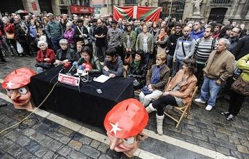 La plataforma Iruñea Askatasunez, junto a familiares y allegados de los seis detenidos por la acusación de desplegar una ikurriña de grandes dimensiones en el txupinazo de este año han comparecido en la Plaza del Ayuntamiento para denunciar este operativo y el elevado nivel de represión que padece la capital navarra.
