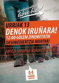 Los activistas cuelgan un pañuelo naranja gigante anunciando el "askegune" en la Plaza del Castillo de Iruñea y muestran su solidaridad con Luis Goñi y Xabier Sagardoi en un mensaje que hoy difunde Ateak Ireki.