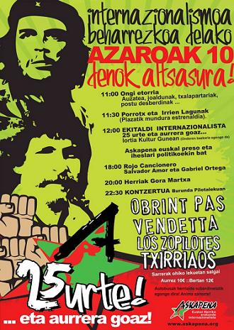 Por todo ello, junto a nuestra adhesión a la manifestación que se realizará en Baiona en defensa de los derechos de las y los presos políticos, queremos invitaros a todos y todas a que nos encontremos en Altsasu para festejar juntos, el 25 aniversario de Askapena.