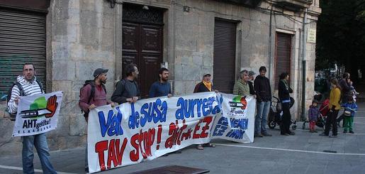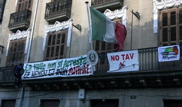 Antes de la concentración el balcón del Consulado italiano fue decorado con pancartas y banderolas de oposición al TAV, que fueron retiradas horas más tarde por la Policía Nacional en presencia del Cónsul.