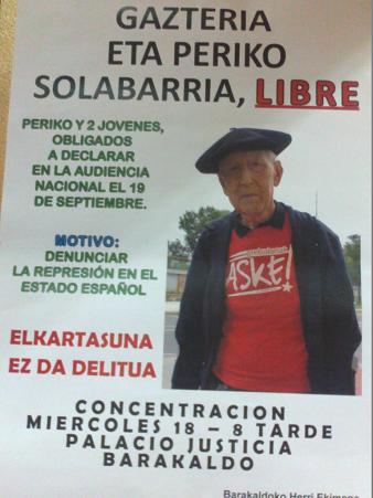 A través de esta comparecencia pública se ha anunciado la concentración que (esperamos multitudinaria), se realizará pasado mañana miércoles, 18 de septiembre, -un día antes de la cita de Periko ante la Audencia Nacional- a las 8 de la tarde, de nuevo, ante el palacio de Justicia de Barakaldo.