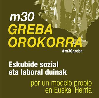 ELA, LAB, ESK, STEE-EILAS, EHNE, HIRU, CGT-LKN eta CNT sindikatuek eta 60tik gora eragilek maiatzaren 30erako greba deialdia egin dute eskubide sozial eta laboral duinen alde eta Euskal Herriarentzako eredu propio bat aldarrikatzeko.